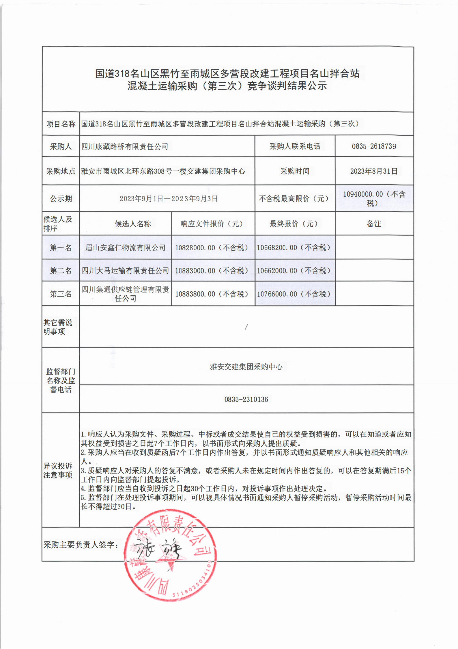 四川康藏路橋有限責任公司國道318名山區(qū)黑竹至至雨城區(qū)多營段改建工程項目名山拌合站混凝土運輸采購(第三次)競爭談判結(jié)果公示