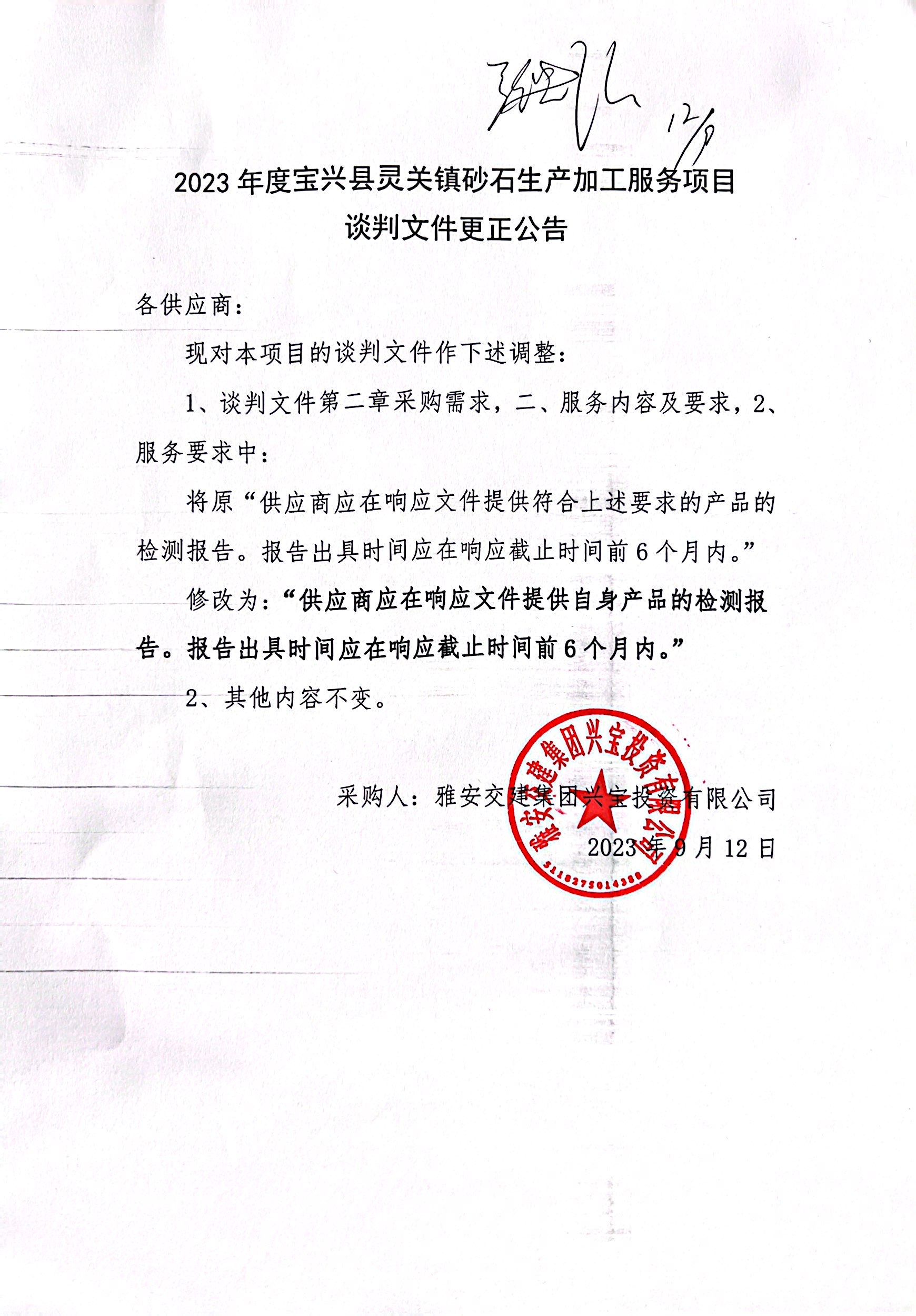 雅安交建集團(tuán)興寶投資有限公司2023年度寶興縣靈關(guān)鎮(zhèn)砂石生產(chǎn)加工服務(wù)項(xiàng)目談判文件更正公告