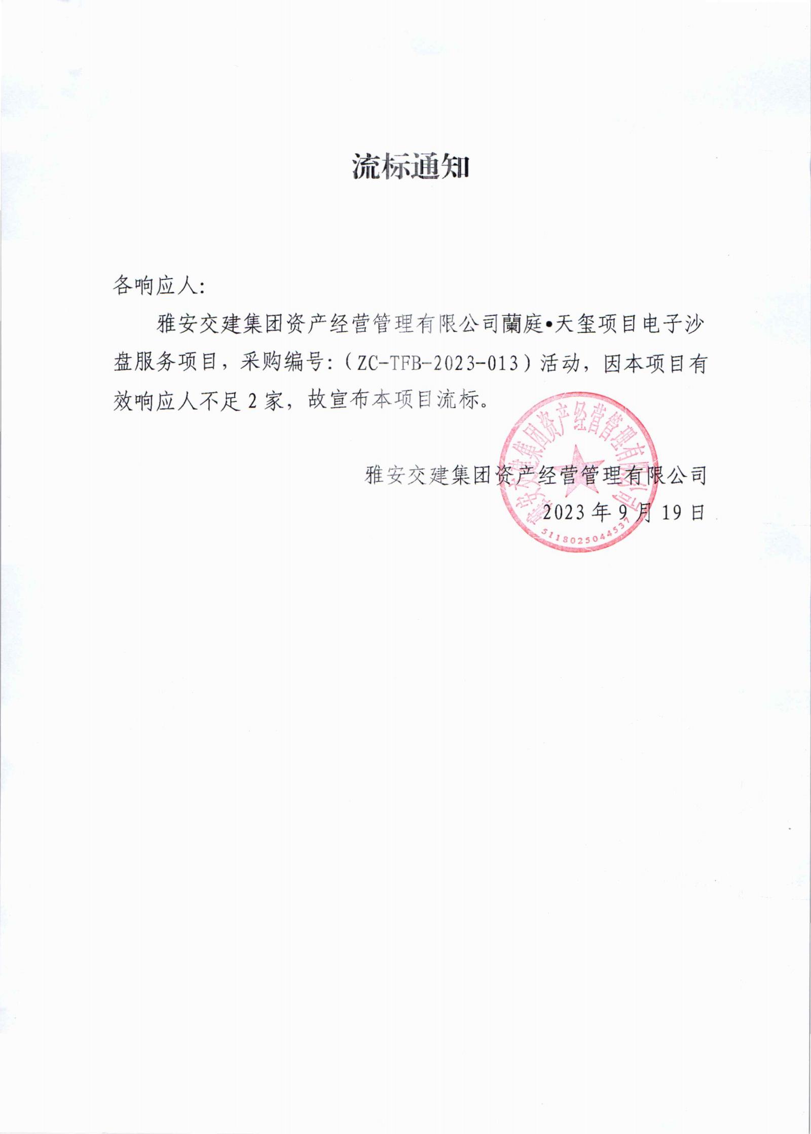 雅安交建集團資產(chǎn)經(jīng)營管理有限公司蘭庭•天璽項目電子沙盤服務(wù)項目流標(biāo)通知書
