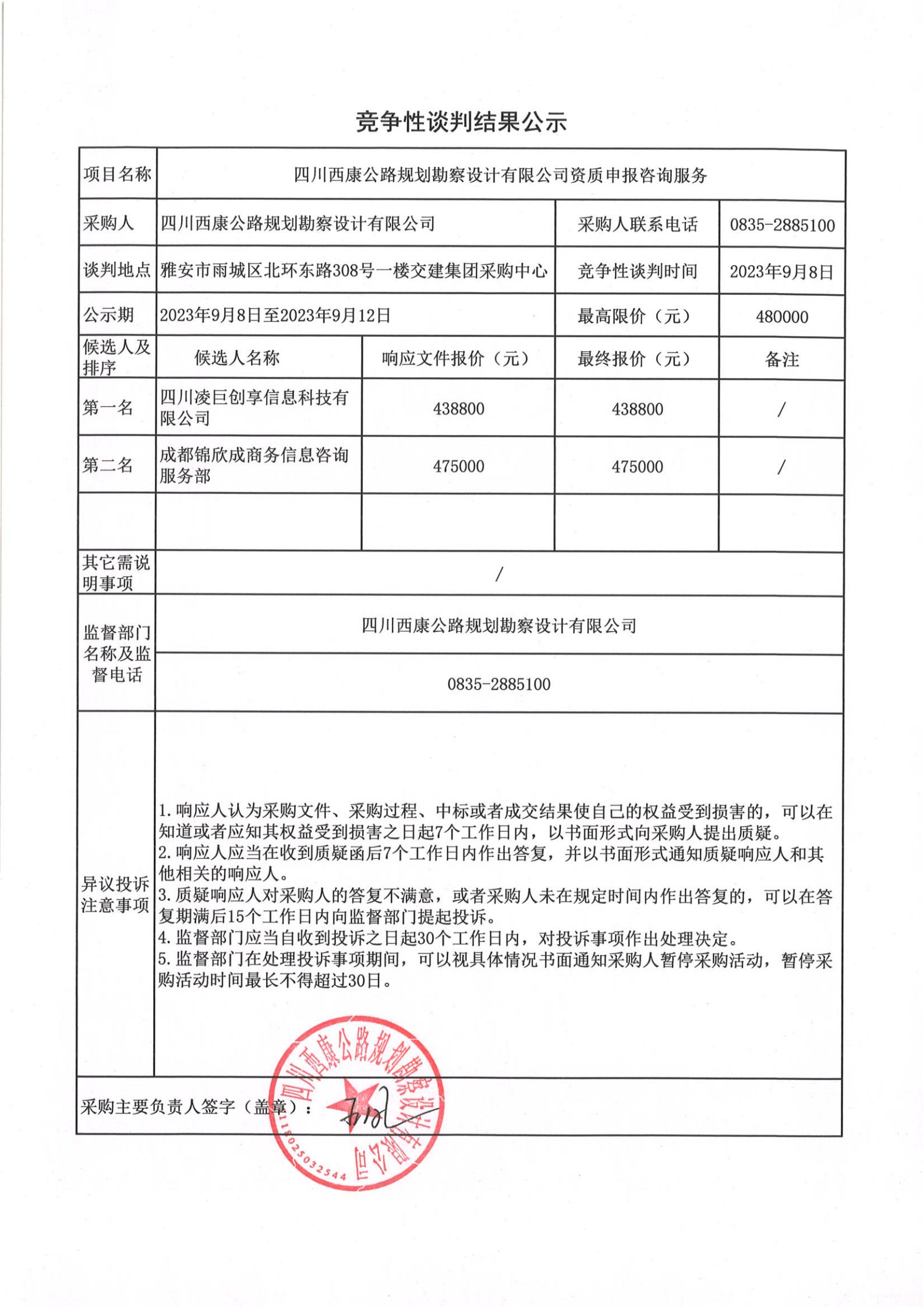 四川西康公路規(guī)劃勘察設計有限公司資質申報咨詢服務競爭談判結果公示