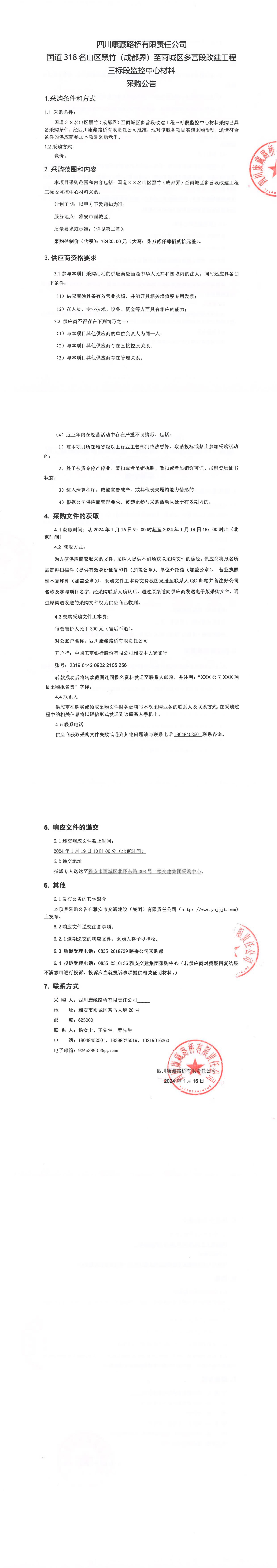 四川康藏路橋有限責(zé)任公司國(guó)道318名山區(qū)黑竹(成都界)至雨城區(qū)多營(yíng)段改建工程三標(biāo)段監(jiān)控中心材料采購公告