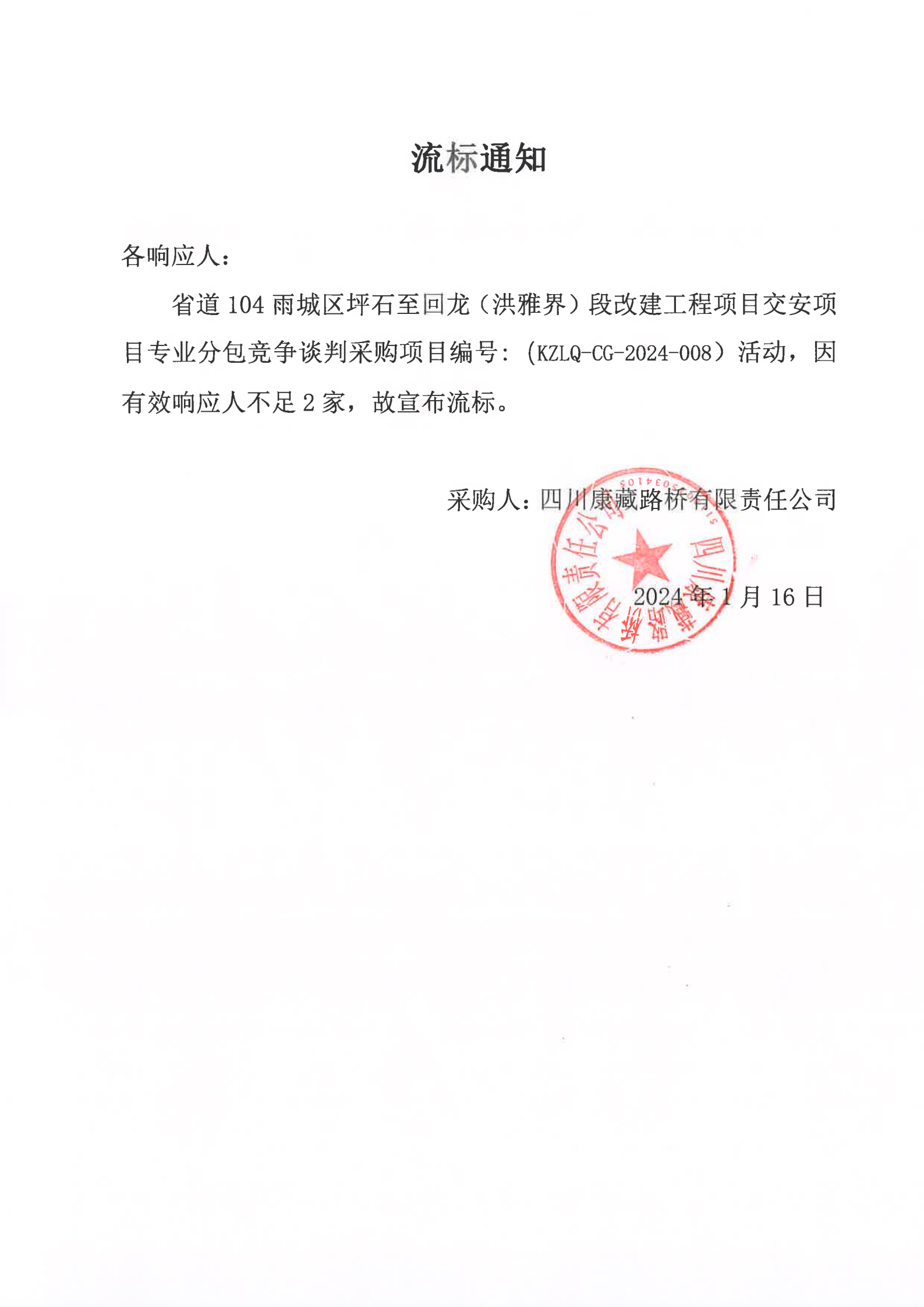 四川康藏路橋有限責(zé)任公司省道104雨城區(qū)坪石至回龍(洪雅界)段改建工程項(xiàng)目交安項(xiàng)目專業(yè)分包競爭談判采購流標(biāo)通知