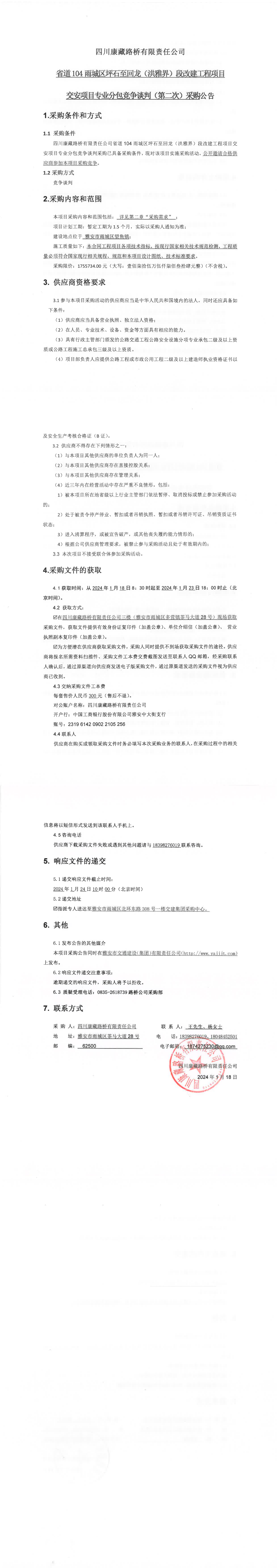四川康藏路橋有限責(zé)任公司省道104雨城區(qū)坪石至回龍(洪雅界)段改建工程項(xiàng)目交安項(xiàng)目專業(yè)分包競(jìng)爭(zhēng)談判(第二次)采購(gòu)公告