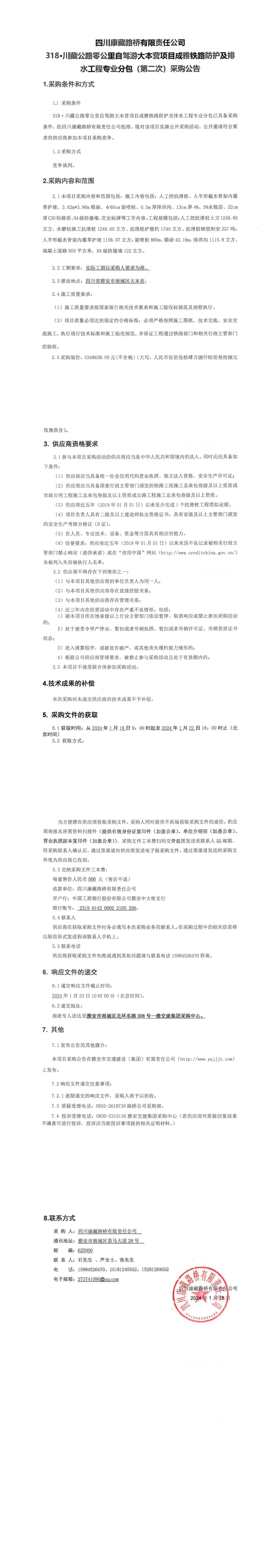 四川康藏路橋有限責(zé)任公司318·川藏公路零公里自駕游大本營(yíng)項(xiàng)目成雅鐵路防護(hù)及排水工程專業(yè)分包(第二次)采購(gòu)公告