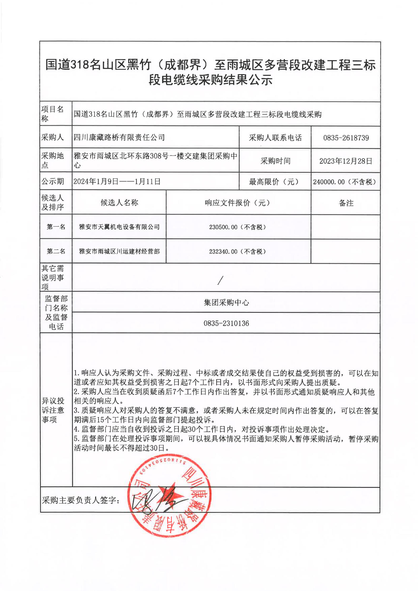 四川康藏路橋有限責(zé)任公司國道318名山區(qū)黑竹(成都界)至雨城區(qū)多營段改建工程三標段電纜線采購結(jié)果公示