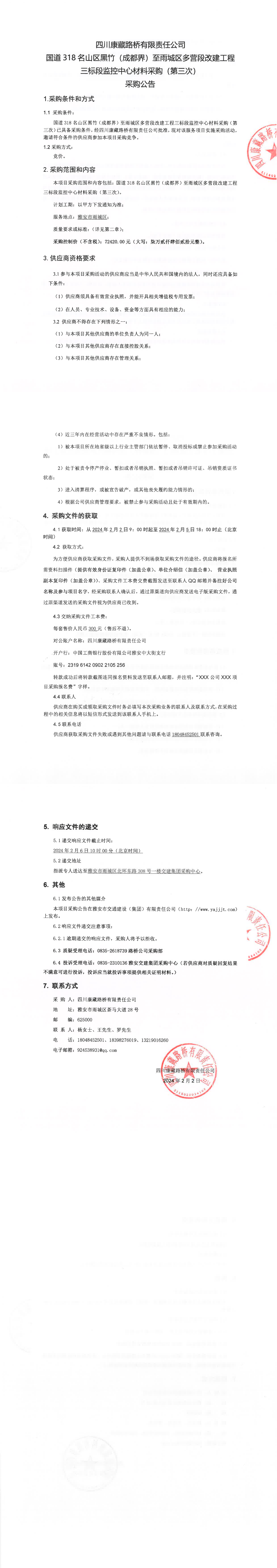 四川康藏路橋有限責任公司國道318名山區(qū)黑竹(成都界)至雨城區(qū)多營段改建工程三標段監(jiān)控中心材料采購(第三次)采購公告