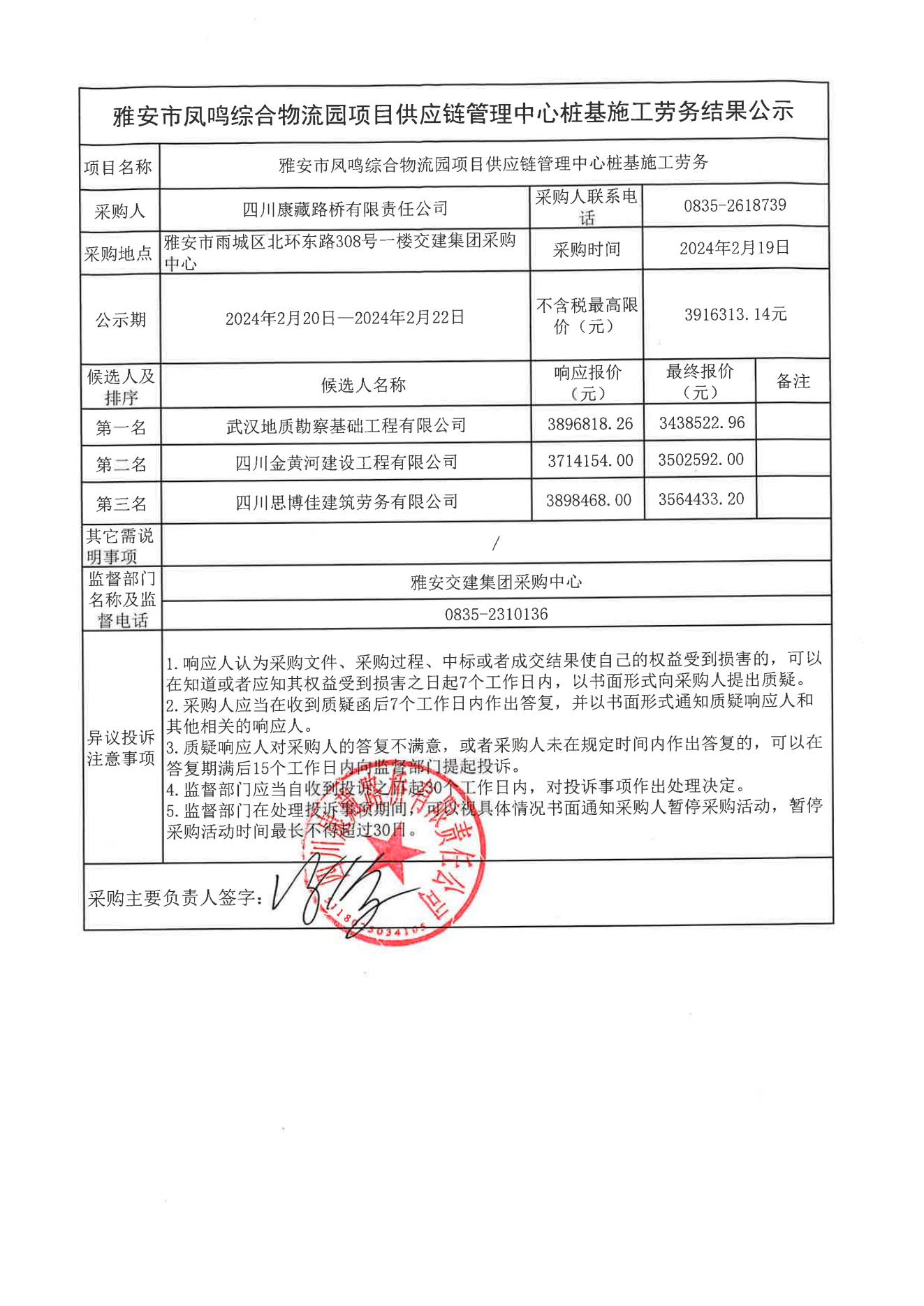四川康藏路橋有限責任公司雅安市鳳鳴綜合物流園項目供應鏈管理中心樁基施工勞務(wù)結(jié)果公示