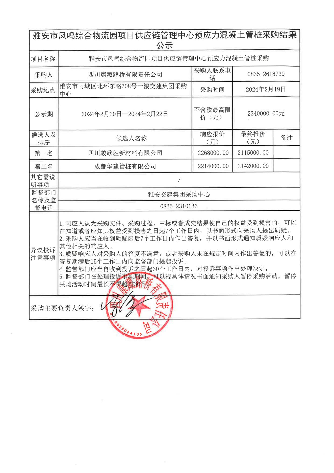 四川康藏路橋有限責(zé)任公司雅安市鳳鳴綜合物流園項(xiàng)目供應(yīng)鏈管理中心預(yù)應(yīng)力混凝土管樁采購結(jié)果公示