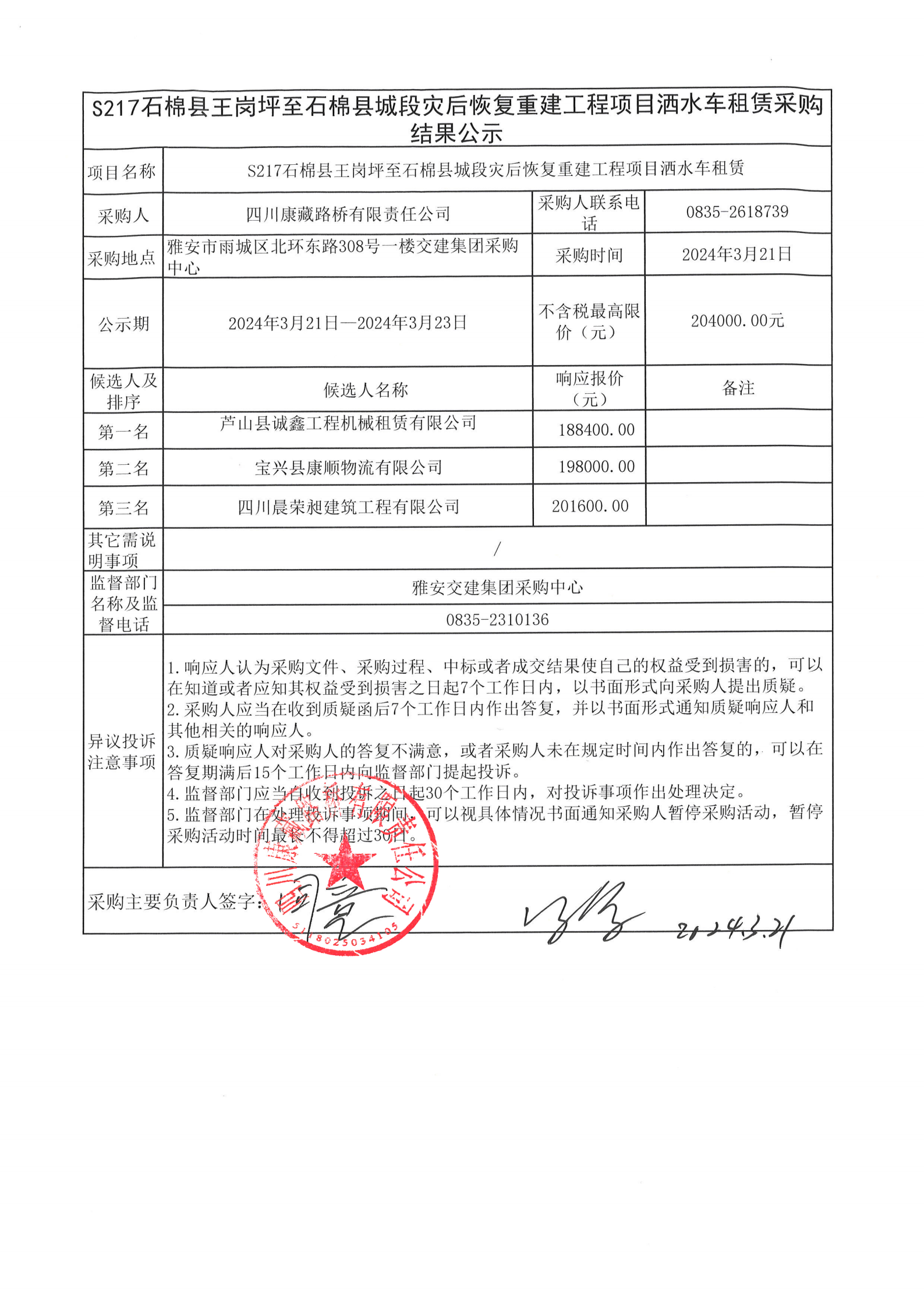 四川康藏路橋有限責任公司S217石棉縣王崗坪至石棉縣城段災后恢復重建工程項目灑水車租賃采購結果公示