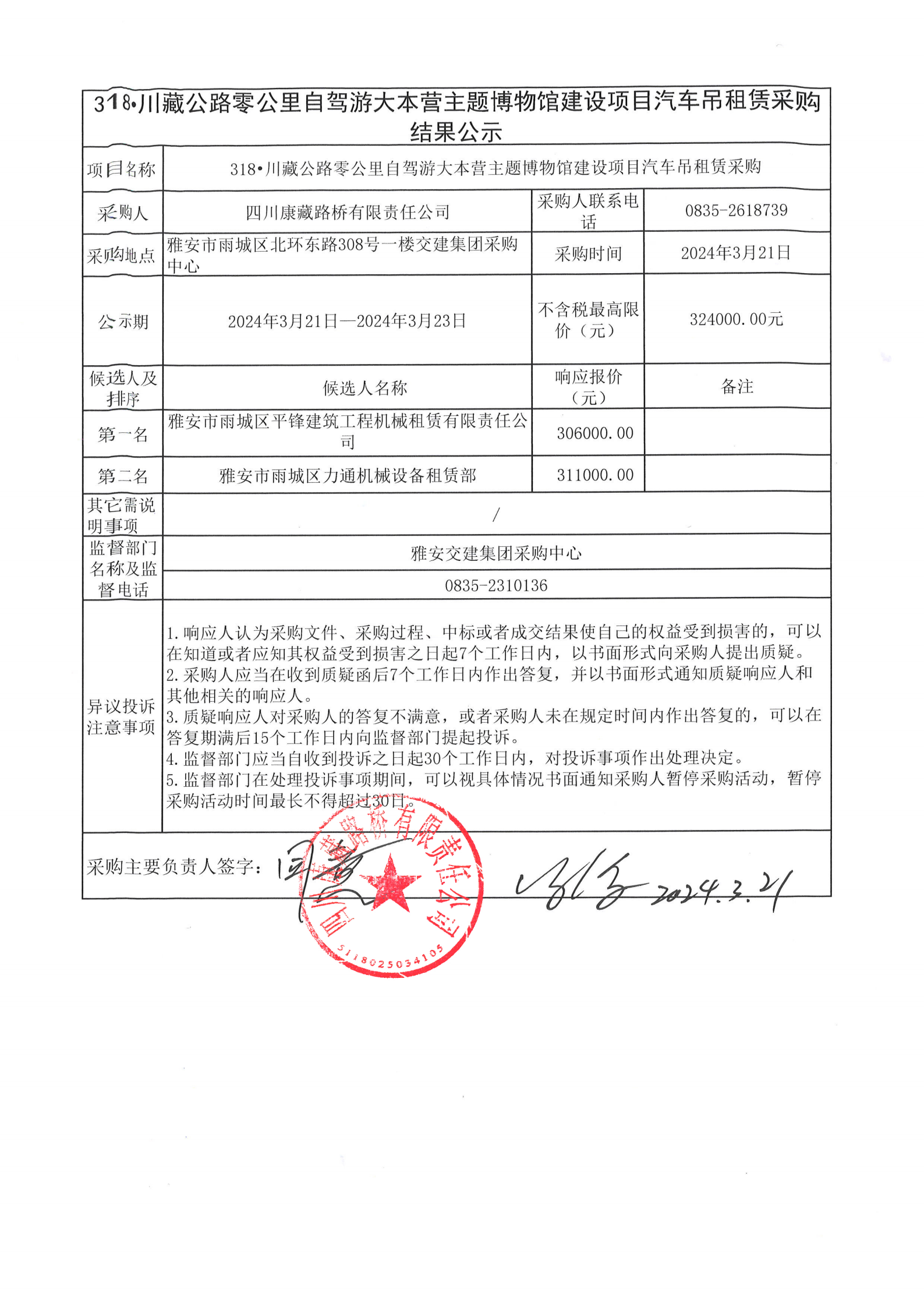 四川康藏路橋有限責(zé)任公司318·川藏公路零公里自駕游大本營主題博物館建設(shè)項目汽車吊租賃采購結(jié)果公示