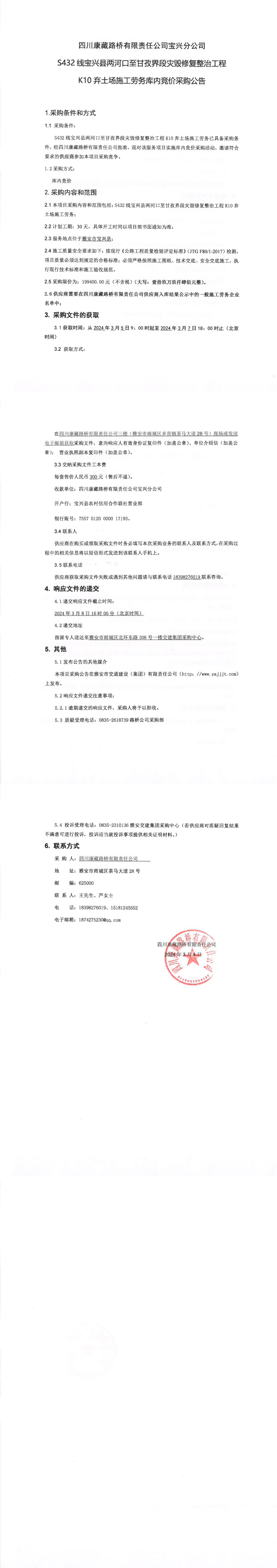 四川康藏路橋有限責(zé)任公司S432線(xiàn)寶興縣兩河口至甘孜界段災(zāi)毀修復(fù)整治工程K10棄土場(chǎng)施工勞務(wù)庫(kù)內(nèi)競(jìng)價(jià)采購(gòu)公告