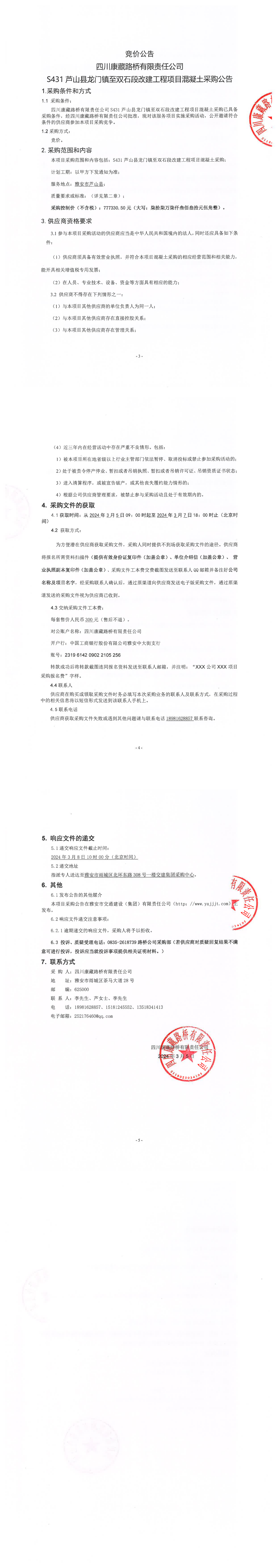 四川康藏路橋有限責(zé)任公司S431蘆山縣龍門(mén)鎮(zhèn)至雙石段改建工程項(xiàng)目混凝土采購(gòu)公告