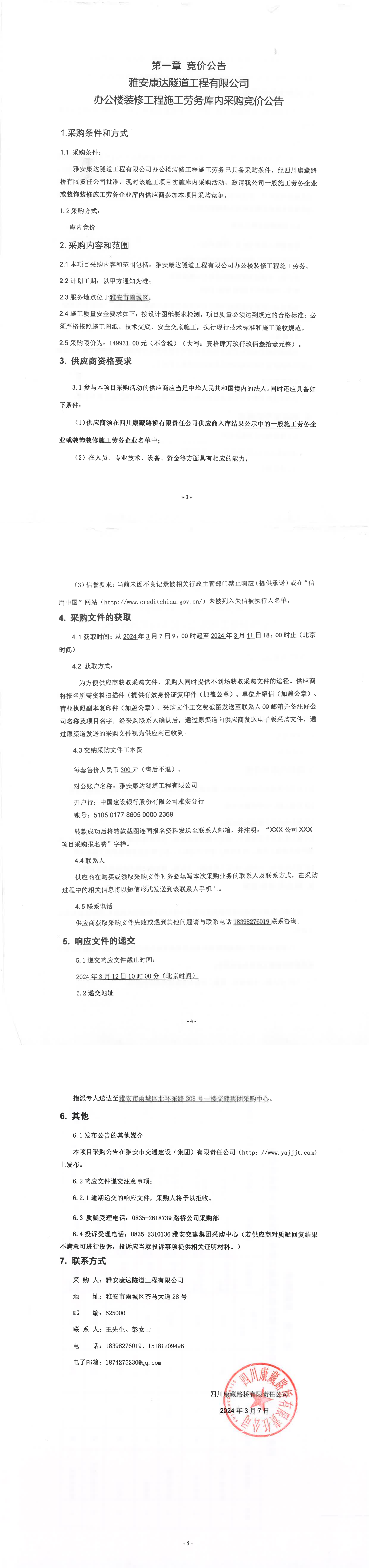 雅安康達隧道工程有限公司辦公樓裝修工程施工勞務庫內采購競價公告