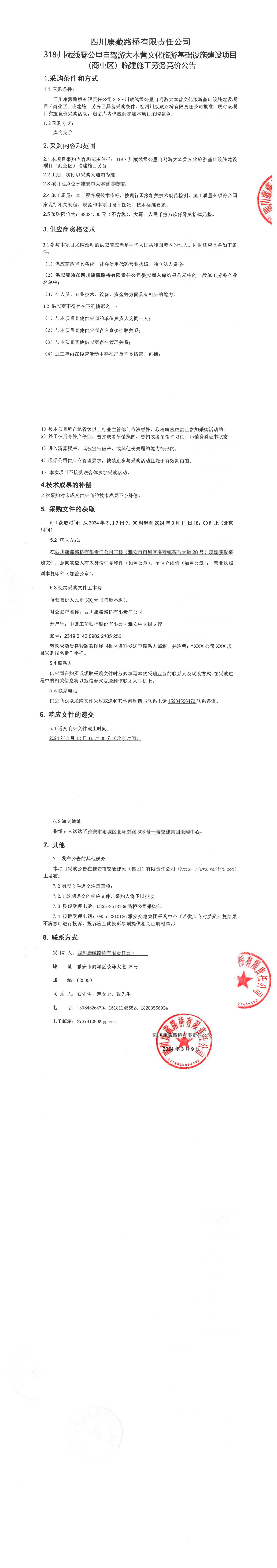 四川康藏路橋有限責任公司318·川藏線零公里自駕游大本營文化旅游基礎設施建設項目(商業(yè)區(qū))臨建施工勞務采購公告