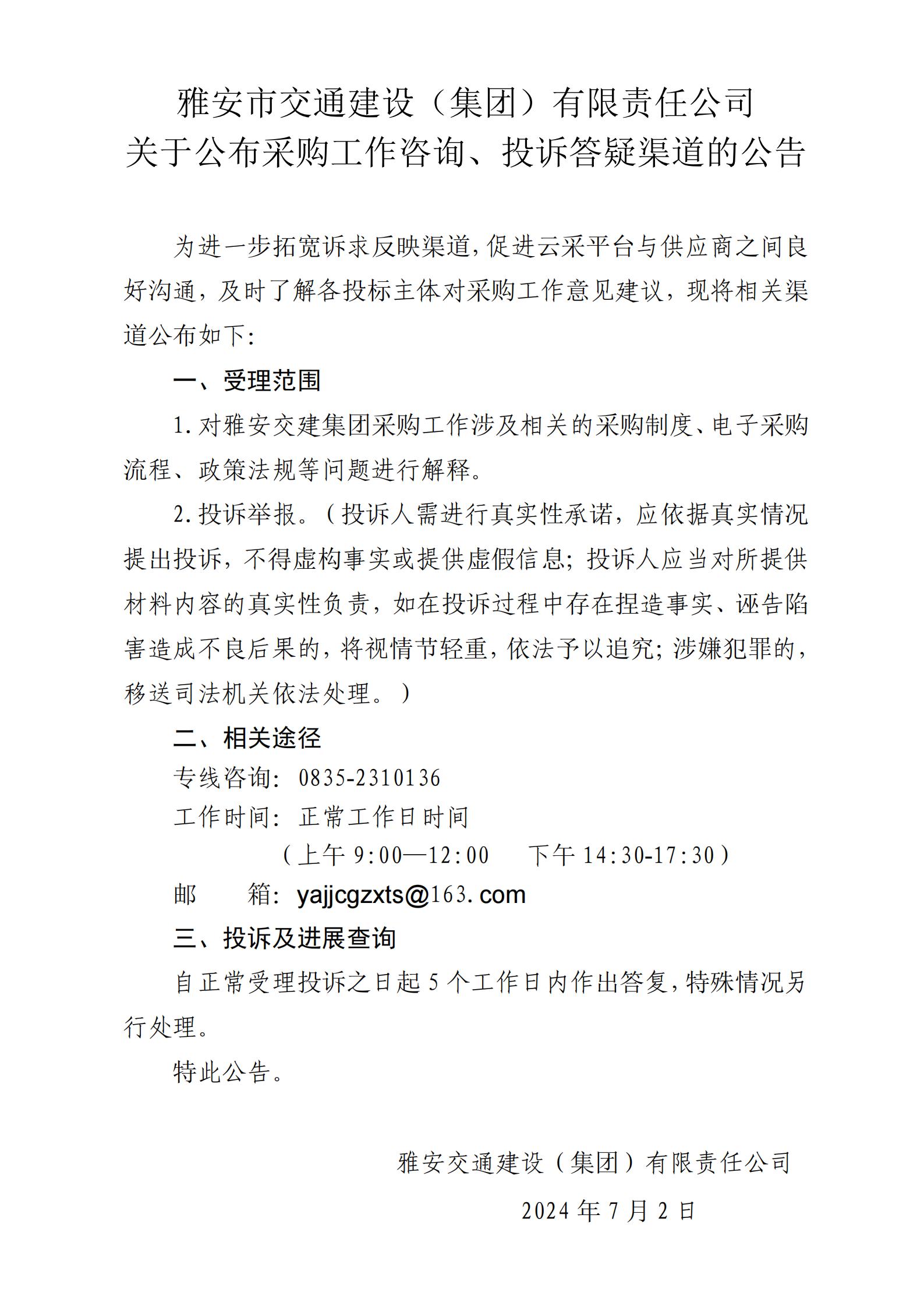 雅安市交通建設(shè)(集團)有限責任公司關(guān)于公布采購工作咨詢、投訴答疑渠道的公告