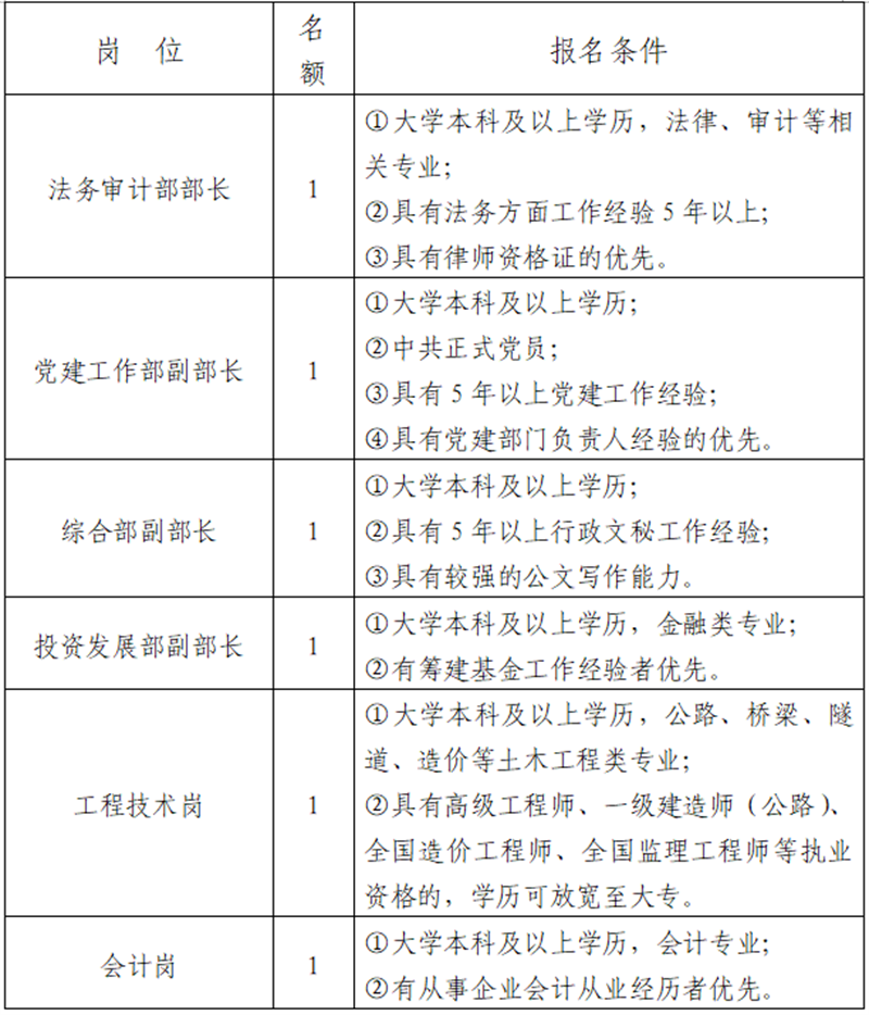 雅安市交建集團是市屬重點國有企業(yè),主要從事交通基礎(chǔ)設(shè)施及配套服務(wù)設(shè)施的投資、建設(shè)、經(jīng)營和交通資源的開發(fā)利用等業(yè)務(wù)。根據(jù)公司發(fā)展需要,決定面向社會公開招聘6名工作人員,現(xiàn)將有關(guān)事項公告如下: