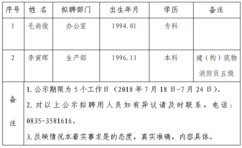 通過公開報(bào)名、資格審查、面試等程序,經(jīng)公司研究確定以下