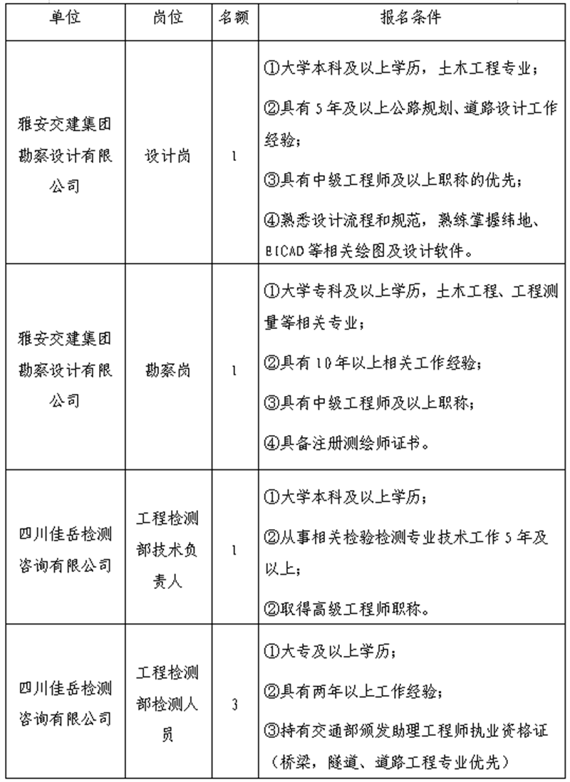 根據(jù)發(fā)展需要,決定面向社會公開招聘雅安市交通建設(shè)(集團(tuán))有限責(zé)任公司(以下簡稱“雅安交建集團(tuán)”)所屬子公司工作人員6名,現(xiàn)將有關(guān)事項(xiàng)公告如下: