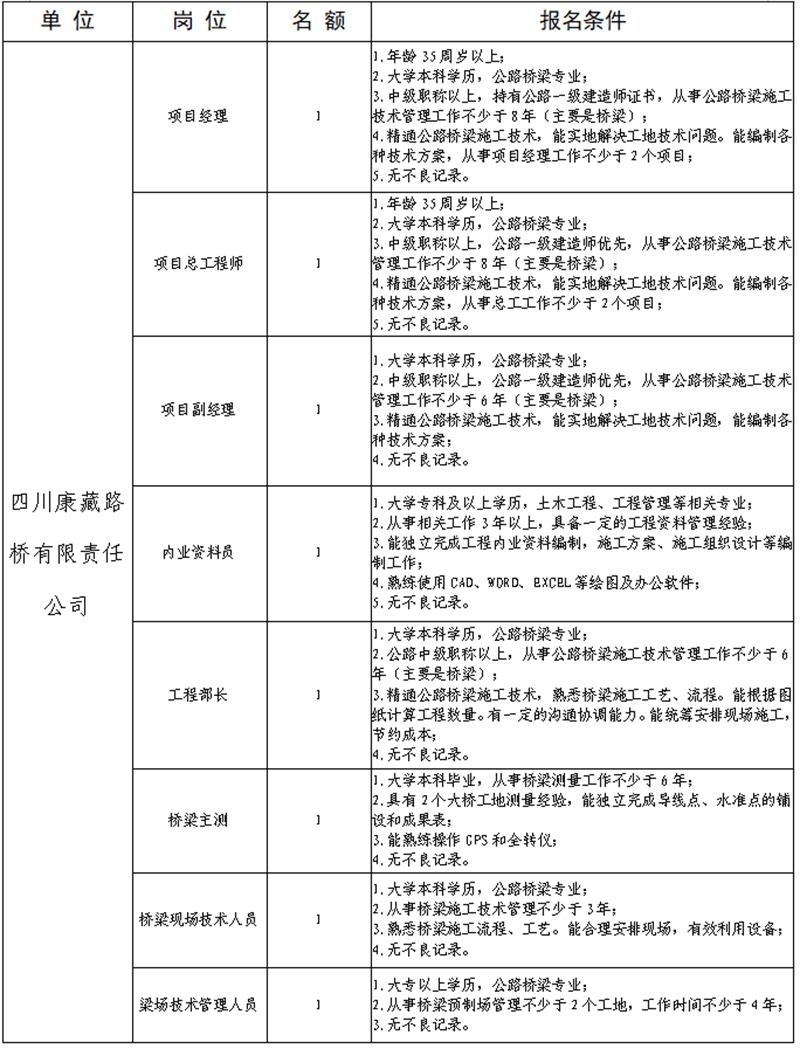 根據(jù)公司業(yè)務(wù)發(fā)展需要,決定面向社會(huì)公開(kāi)招聘省道104線草壩至姚橋段改建項(xiàng)目部專業(yè)技術(shù)人才8名,現(xiàn)將有關(guān)事項(xiàng)公告如下: