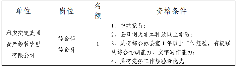 根據(jù)發(fā)展需要,決定面向社會公開招聘雅安市交通建設(shè)(集團)有限責任公司(以下簡稱“雅安交建集團”)所屬子一般工作人員1名,現(xiàn)將有關(guān)事項公告如下:
