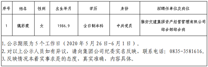根據(jù)雅安市交通建設(shè)(集團(tuán))有限責(zé)任公司招聘公告,經(jīng)公開報(bào)名、資格初審、筆試、面試、體檢考察等環(huán)節(jié),現(xiàn)將以下1名擬聘用人員予以公示: