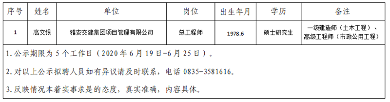 根據(jù)雅安市交通建設(shè)(集團(tuán))有限責(zé)任公司人才引進(jìn)方案,經(jīng)集團(tuán)研究,現(xiàn)將以下擬聘用人員予以公示: