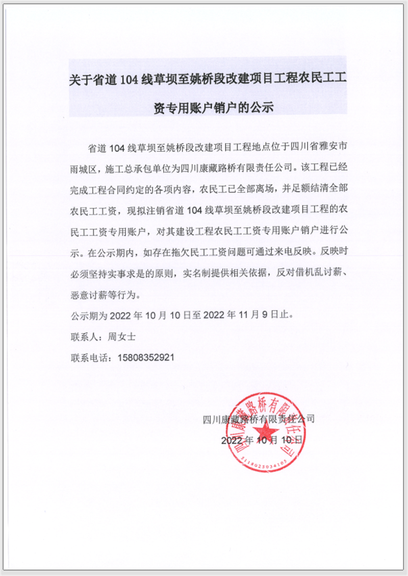 關(guān)于省道104線草壩至姚橋段改建項(xiàng)目工程農(nóng)民工工資專用賬戶銷戶的公告