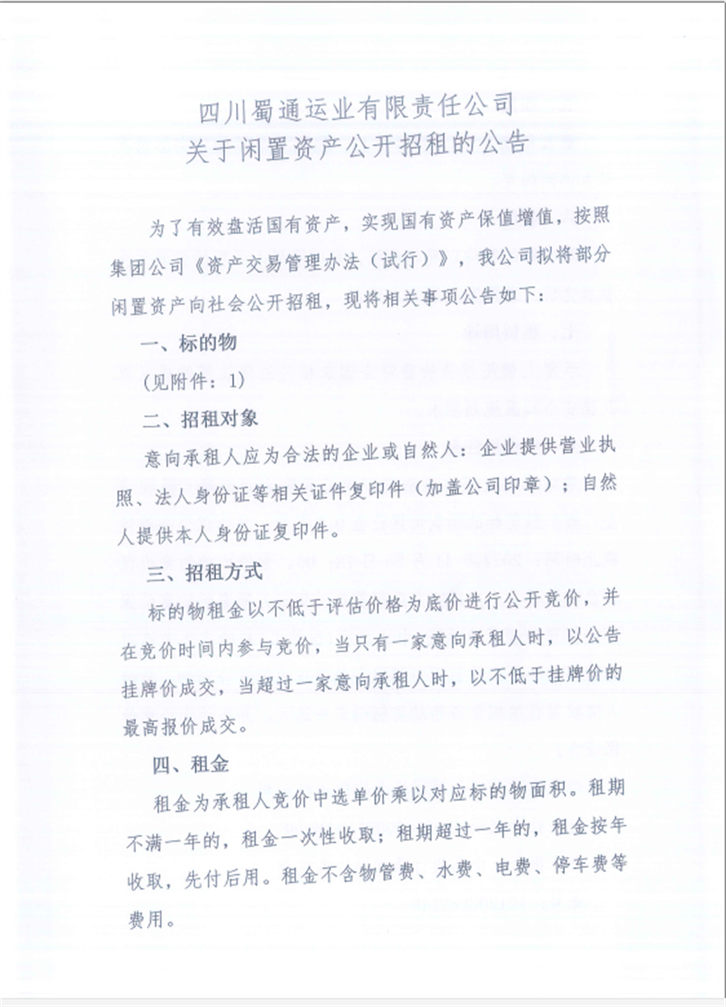蜀通公司閑置資產(chǎn)招租公告