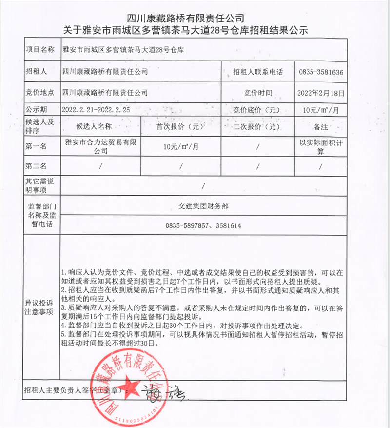 四川康藏路橋有限責任公司關(guān)于雅安市雨城區(qū)多營鎮(zhèn)茶馬大道28號倉庫招租結(jié)果的公示