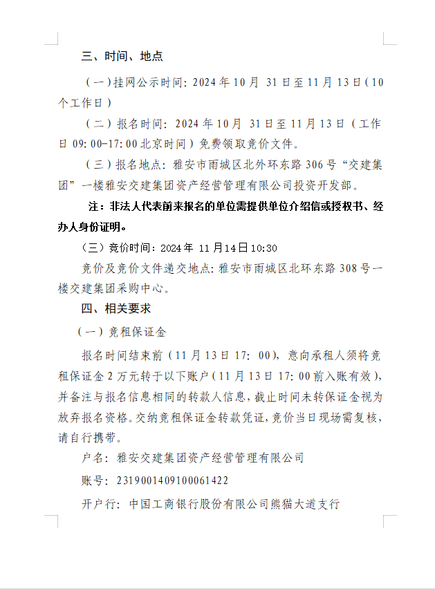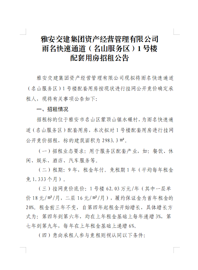雅安交建集團(tuán)資產(chǎn)經(jīng)營(yíng)管理有限公司雨名快速通道(名山服務(wù)區(qū))1號(hào)樓配套用房招租公告