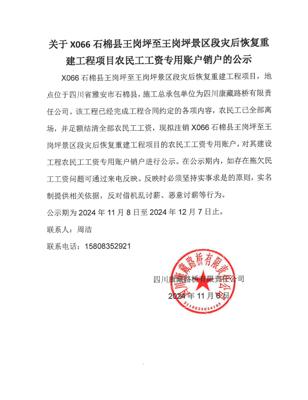 關(guān)于X066石棉縣王崗坪至王崗坪景區(qū)段災(zāi)后恢復(fù)重建工程項(xiàng)目農(nóng)民工工資專用賬戶銷戶的公示