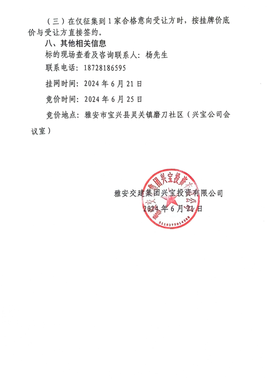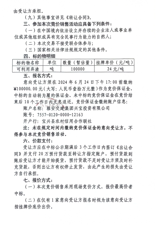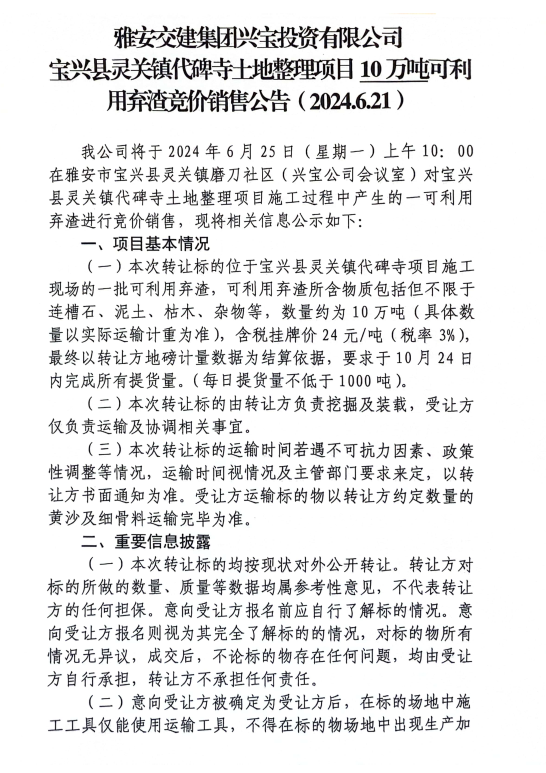 雅安交建集團(tuán)興寶投資有限公司寶興縣靈關(guān)鎮(zhèn)代碑寺土地整理項(xiàng)目10萬噸可利用棄渣競(jìng)價(jià)銷售公告(2024.6.21)