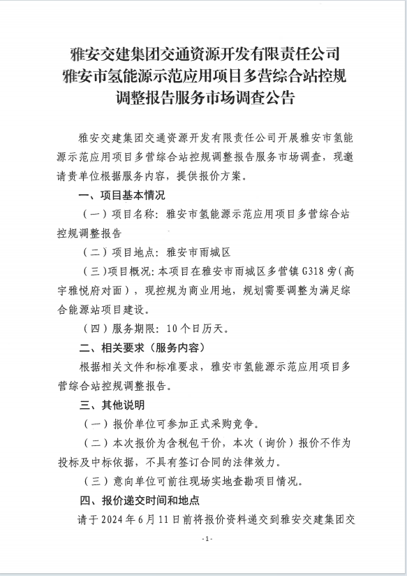 雅安交建集團交通資源開發(fā)有限責任公司雅安市氫能源示范應用項目多營綜合站控規(guī)調(diào)整報告服務市場調(diào)查公告