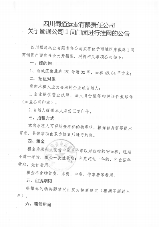 四川蜀通運業(yè)有限責任公司關于蜀通公司1間門面進行掛網的公告