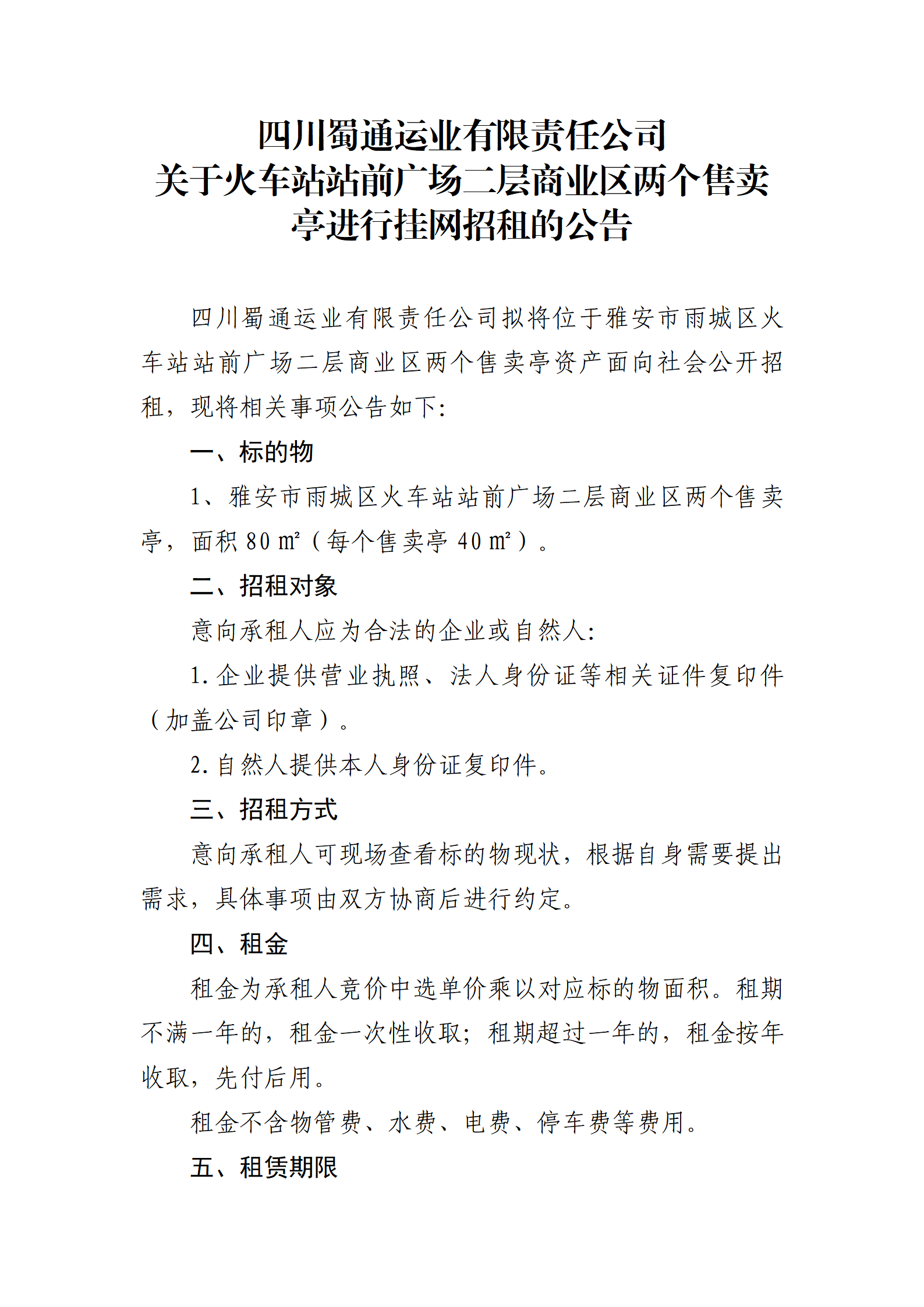 四川蜀通運(yùn)業(yè)有限責(zé)任公司關(guān)于火車(chē)站站前廣場(chǎng)二層商業(yè)區(qū)兩個(gè)售賣(mài)亭進(jìn)行掛網(wǎng)招租的公告