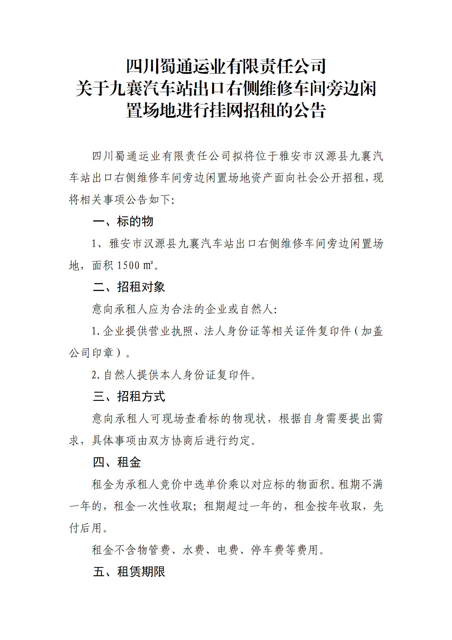四川蜀通運業(yè)有限責任公司 關(guān)于九襄汽車站出口右側(cè)維修車間旁邊閑置場地進行掛網(wǎng)招租的公告