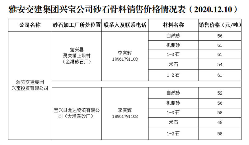 雅安交建集團興寶公司砂石骨料銷售價格情況表(2020.12.10)