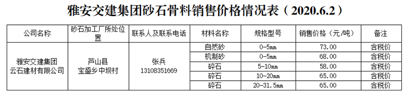 云石建材有限公司。云石公司是蘆山縣人民政府指定蘆山縣投資經(jīng)營管理有限責任公司與雅安市交通建設(shè)(集團)有限責任公司共同組建的合資公司。公司在蘆山縣寶盛鄉(xiāng)中壩村建立砂石生產(chǎn)線,年產(chǎn)各類砂石骨料約50萬噸,生產(chǎn)廠區(qū)距雨城區(qū)中心城區(qū)約60公里。