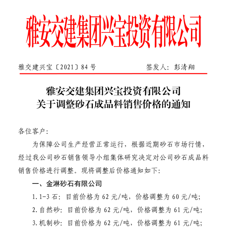 雅安交建集團(tuán)丹石公司關(guān)于調(diào)整砂石成品骨料銷(xiāo)售價(jià)格的通知(2021.12.9)