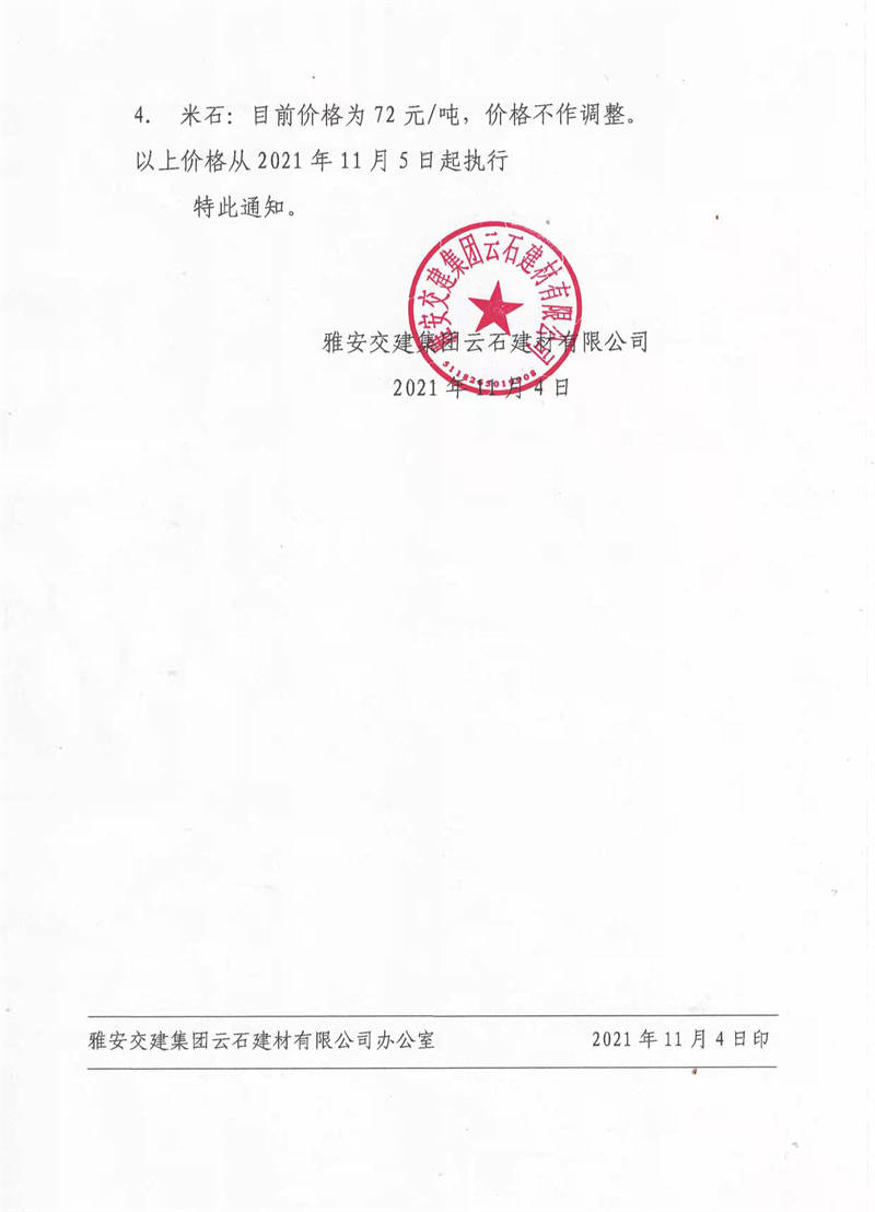 雅安交建集團云石公司關于調整成品料銷售價格的通知(2021.11.4)