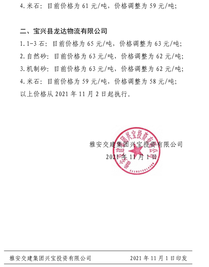 雅安交建集團興寶公司關(guān)于調(diào)整成品料銷售價格的通知(2021.11.2)