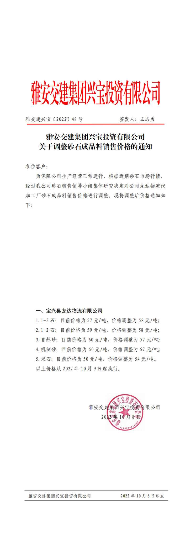 雅交建興寶〔2022〕48號 關(guān)于調(diào)整砂石成品料銷售價(jià)格的通知10.8
