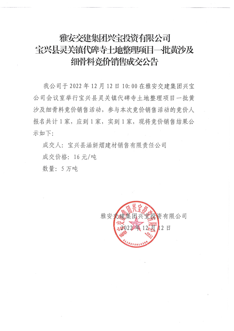 雅安交建集團興寶投資有限公司寶興縣靈關鎮(zhèn)代碑寺土地整理項目5萬噸黃沙及細骨料競價銷售成交公告(2022-12-12)