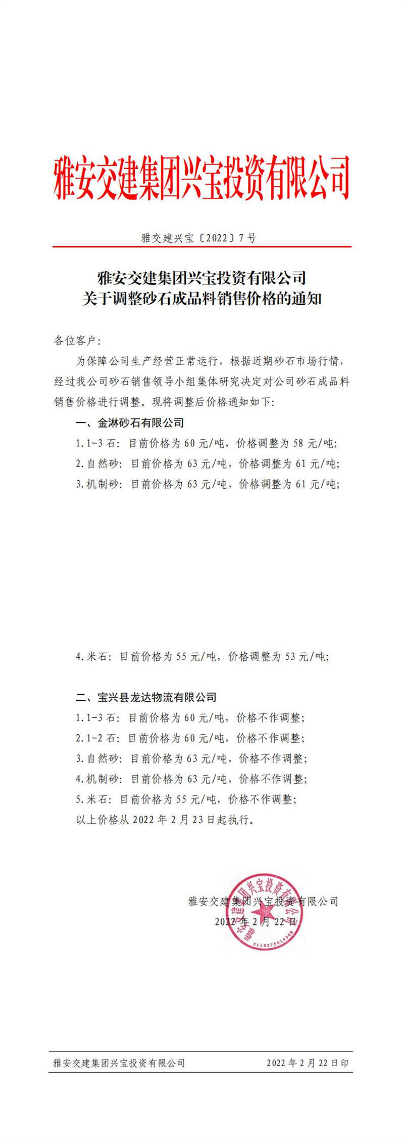 ÑŰ²½»½¨ÅdŒš¹«Ë¾êP(gu¨¡n)ÓÚÕ{(di¨¤o)Õûɰʯ³ÉÆ·ÁÏäNÊÛƒr(ji¨¤)¸ñµÄ֪ͨ£¨2022-3-1£©