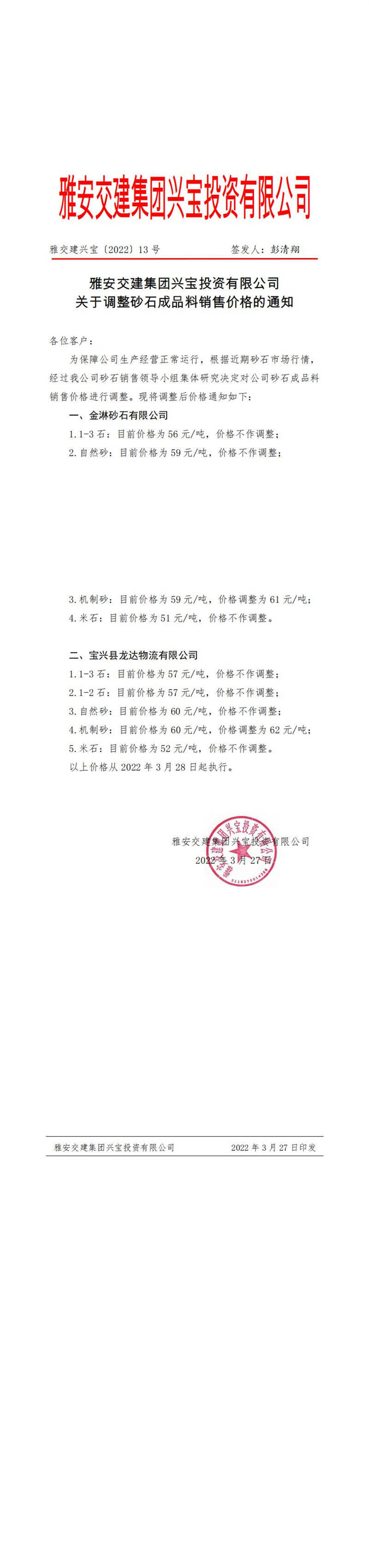 雅交建興寶〔2022〕13號(hào) 關(guān)于調(diào)整砂石成品料銷(xiāo)售價(jià)格的通知-3月27日