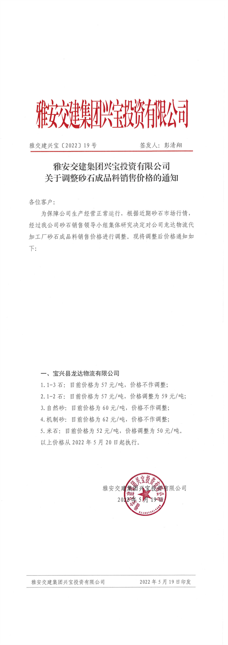 ÑŰ²½»½¨¼¯ˆFÅdŒš¹«Ë¾êP(gu¨¡n)ÓÚÕ{(di¨¤o)Õûɰʯ³ÉÆ·ÁÏäNÊÛƒr¸ñµÄ֪ͨ-2022-5-19