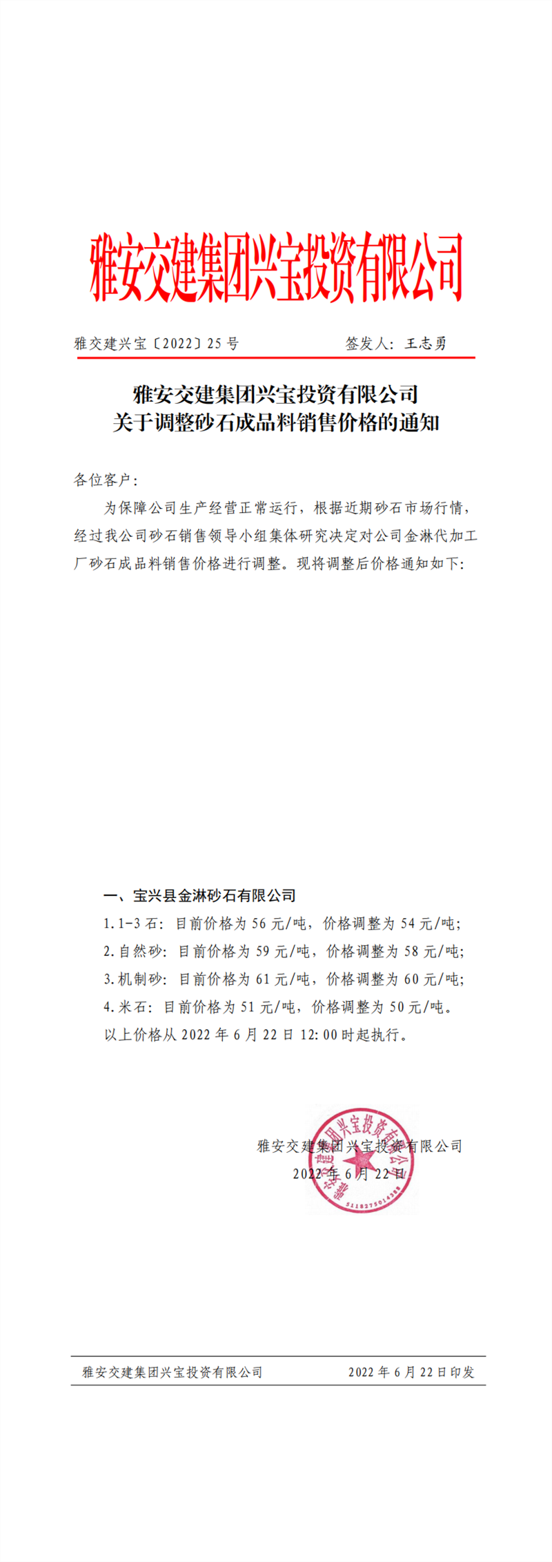 雅安交建集團(tuán)興寶投資有限公司 關(guān)于調(diào)整砂石成品料銷售價(jià)格的通知(2022-6-22)