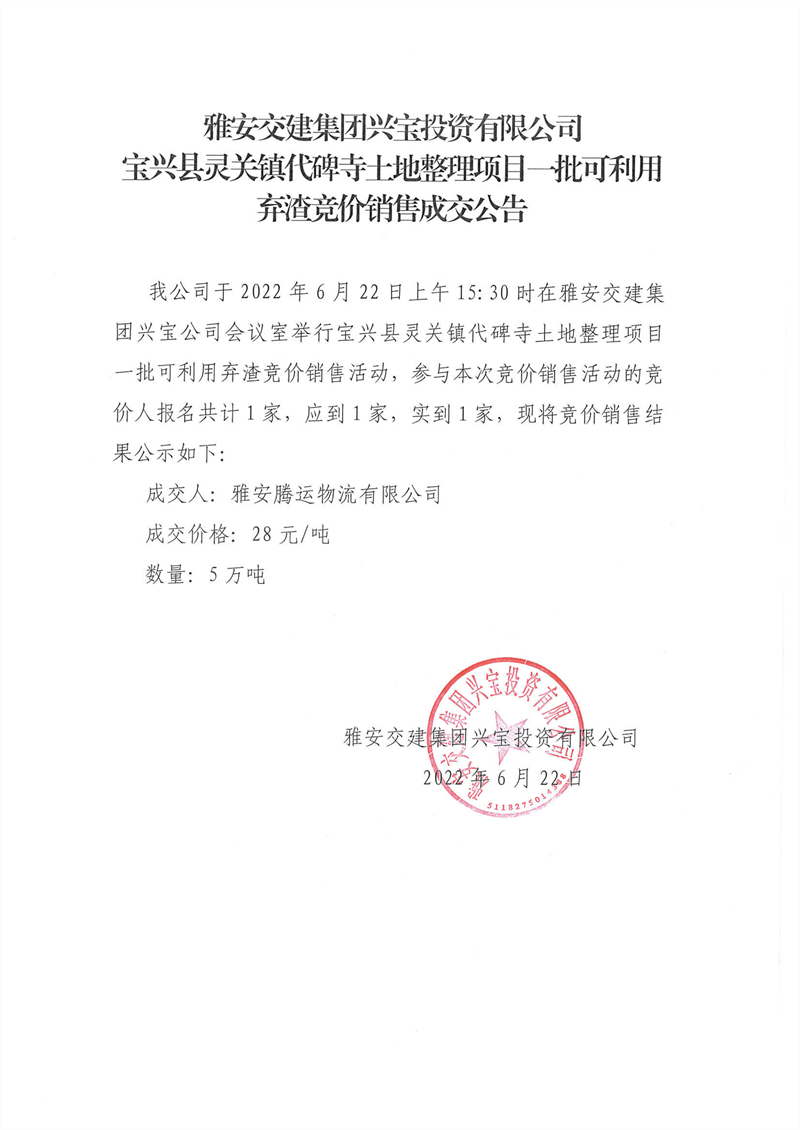 雅安交建集團(tuán)興寶投資有限公司 關(guān)于調(diào)整砂石成品料銷售價(jià)格的通知(2022-6-22)