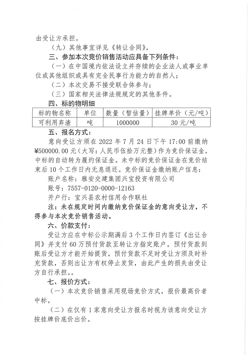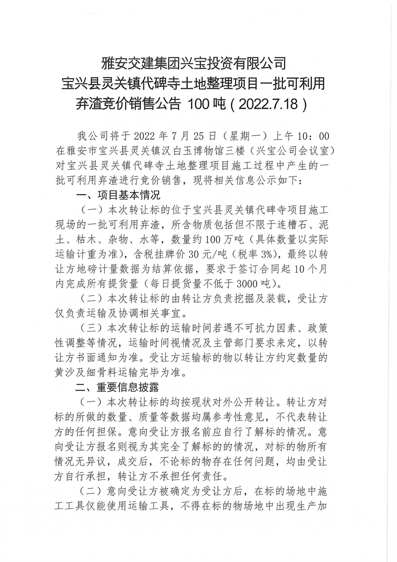 興寶公司寶興縣靈關(guān)鎮(zhèn)代碑寺土地整理項目10萬噸可利用棄渣競價銷售掛網(wǎng)公告掛網(wǎng)公告7.22(5萬噸)