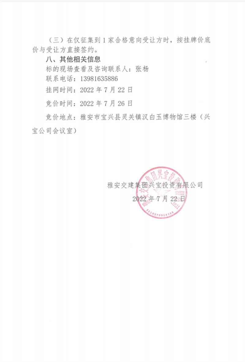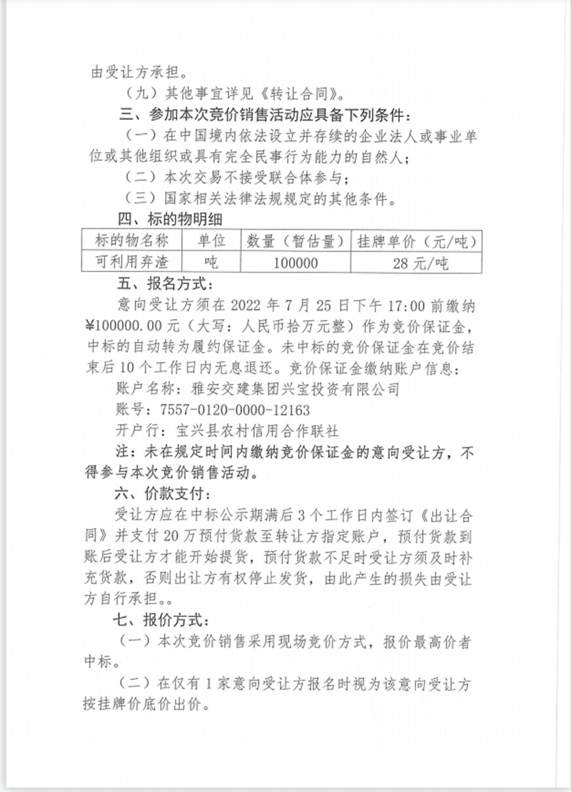 興寶公司寶興縣靈關(guān)鎮(zhèn)代碑寺土地整理項(xiàng)目10萬噸可利用棄渣競價(jià)銷售掛網(wǎng)公告掛網(wǎng)公告7.22(5萬噸)